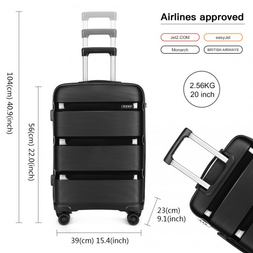 K2092L - Kono 20 Inch Bright Hard Shell PP Carry-On Suitcase In Cabin Size - Black