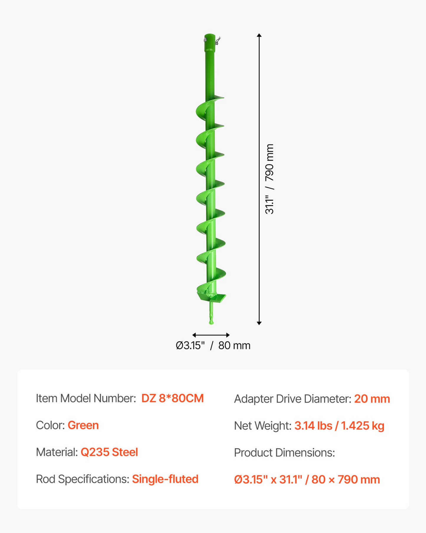 VEVOR Auger Drill Bit 3.15 x 31.1 in Earth Spiral Post Hole Digger Planter Tool