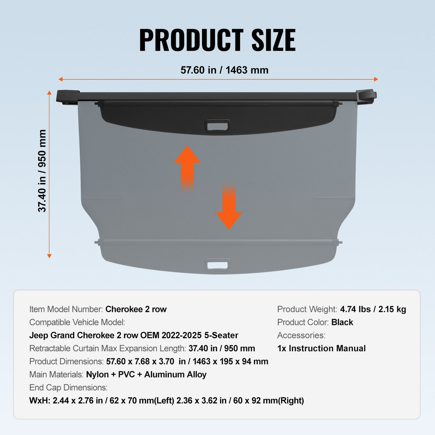 Main Materials: Nylon + PVC + Aluminum Alloy,Product Color: Black,Retractable Curtain Max Expansion Length: 37.40 in/950 mm,Item Model Number: Cherokee 2 row,Product Weight: 4.74 lbs/2.15 kg,End Cap Dimensions: WxH: 2.44 x 2.76 in/62 x 70 mm(Left) 2.36 x 3.62 in/60 x 92 mm(Right),Product Dimensions: 57.60 x 7.68 x 3.70 in/1463 x 195 x 94 mm,Compatible Vehicle Model: Jeep Grand Cherokee 2 row OEM 2022-2025 5-Seater