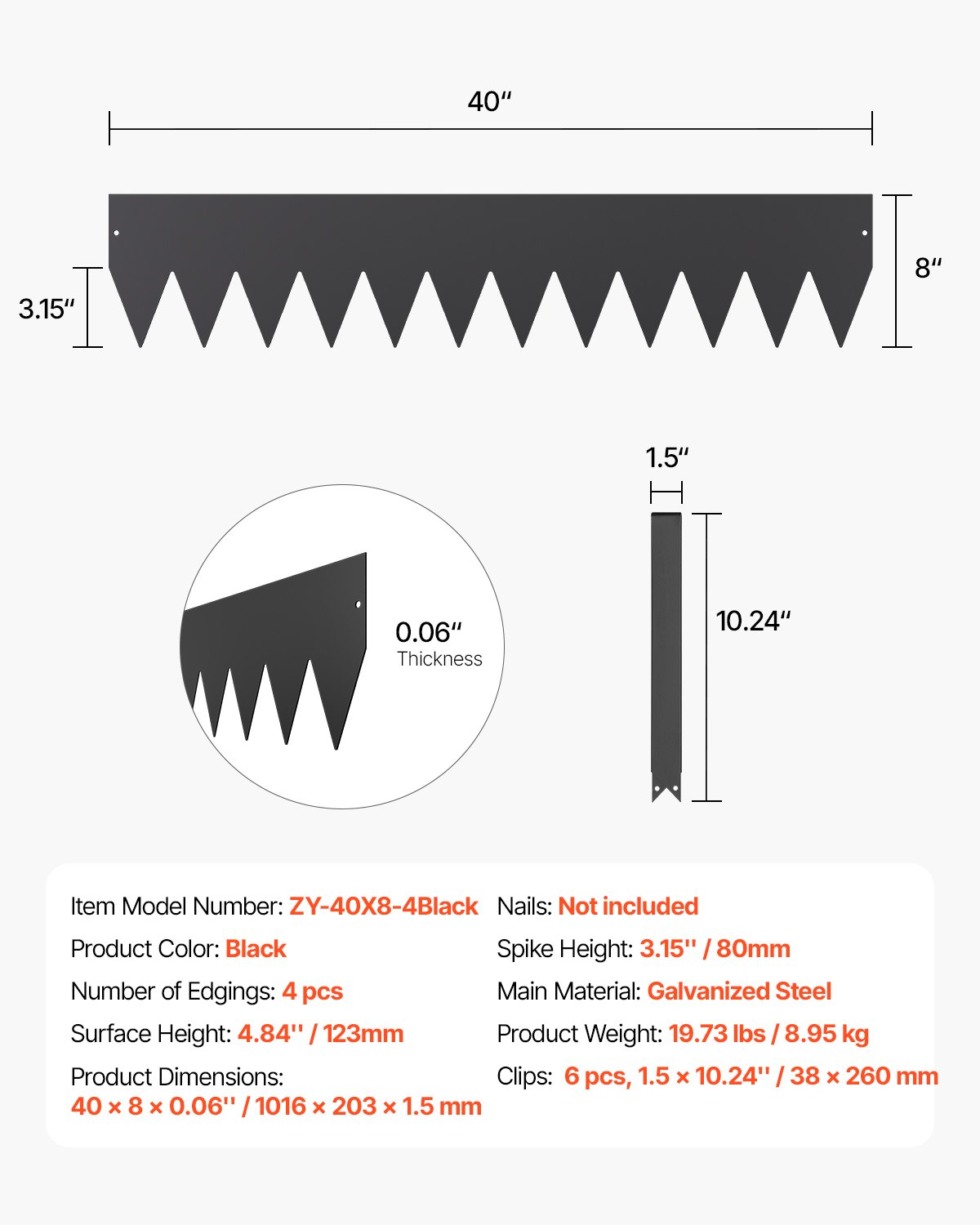 Surface Height: 4.84 in/ 123mm,Clips: 6 pcs, 1.5 x 10.24 in/ 38 x 260 mm,Number of Edgings: 4 pcs,Nails: Not included,Product Color: Black,Item Model Number: ZY-40X8-4Black,Product Weight: 19.73 lbs / 8.95 kg,Product Dimensions: 40 x 8 x 0.06 in/ 1016 x 203 x 1.5 mm,Spike Height: 3.15 in/ 80mm,Main Material: Galvanized Steel