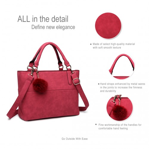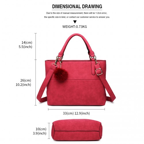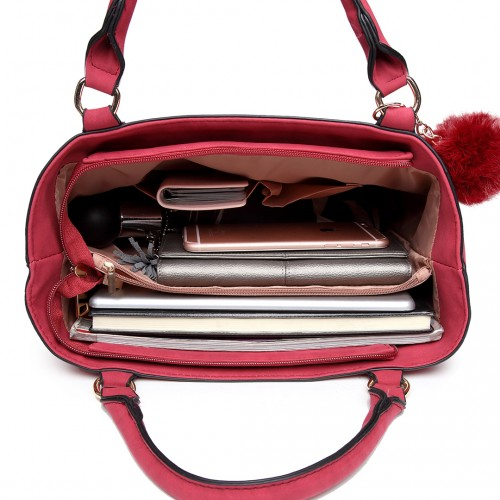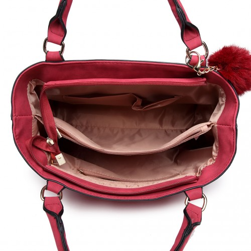 E1768 CT - Miss Lulu PomPom Suede Shoulder Bag Claret