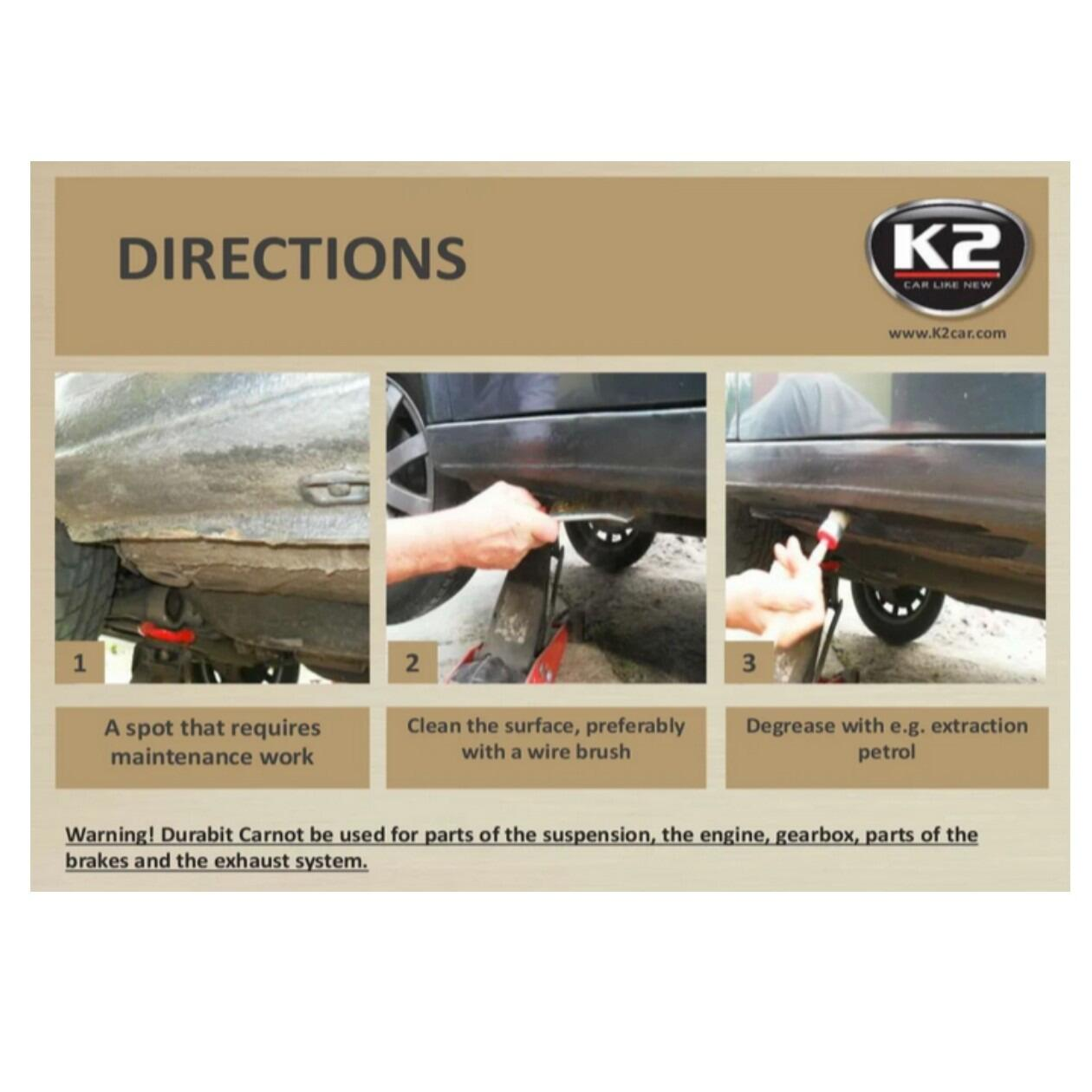 K2 DURABIT is a high-performance bitumen-rubber based undercoat designed to protect your car's chassis from harsh mechanical impacts such as stones, water, and salt. This durable formula also has a sound-absorbing effect, forming a flexible and long-lasting protective layer. Ideal for preserving the underside of your vehicle, it ensures enhanced durability and protection from everyday road wear.