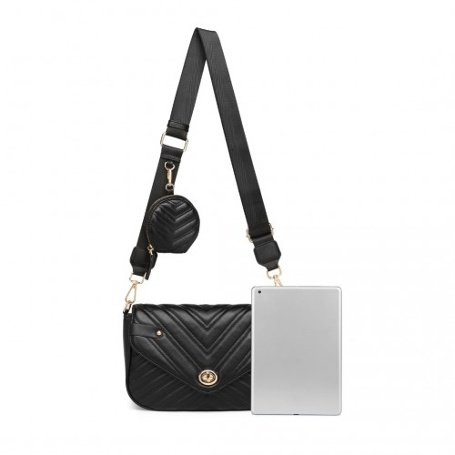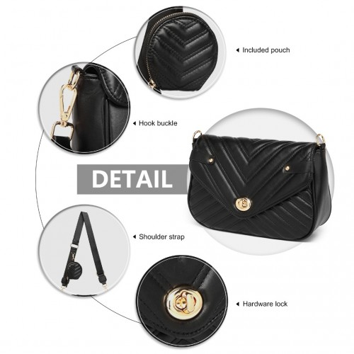LB2138 - Miss Lulu V-quilted Flap Leather Shoulder Bag - Black