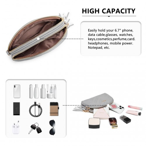 Ample space for your essential items, including your cell or mobile phone, purse, keys, wallet, credit and debit cards and your cosmetics and toiletries.