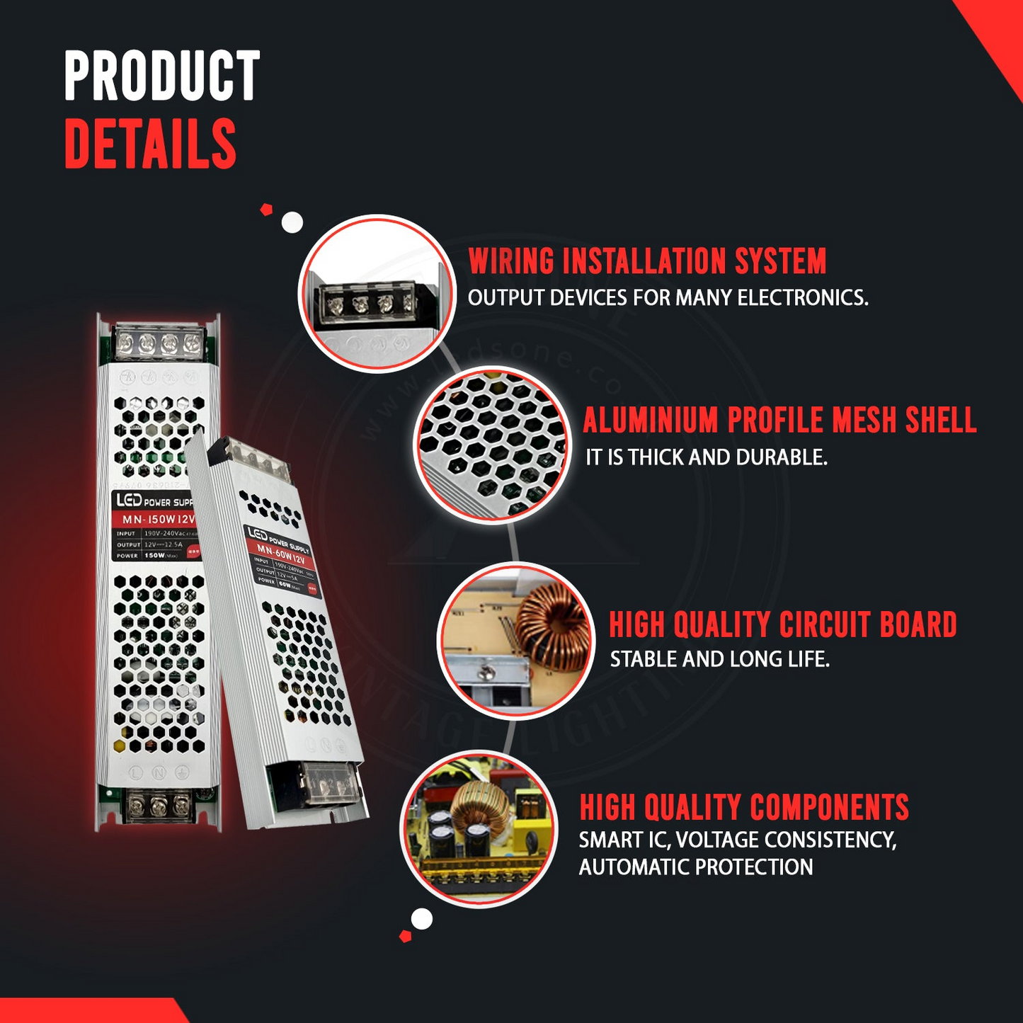 Power your lighting and low-voltage devices efficiently with our high-performance 12V 150W LED Driver. Engineered for reliability and safety, this ultra-slim power supply converts AC 190–240V to a stable 12V DC output at 12.5A—ideal for LED strip lights, modules, and other DC-powered equipment.