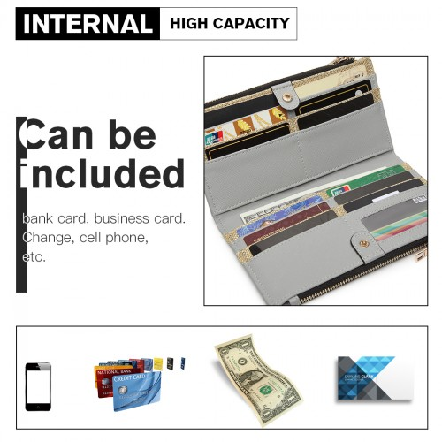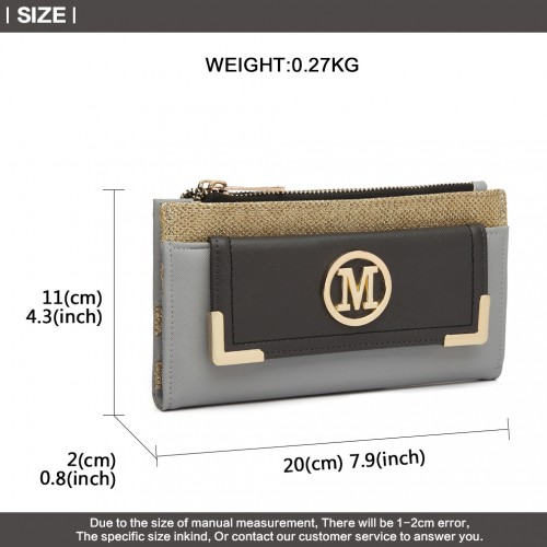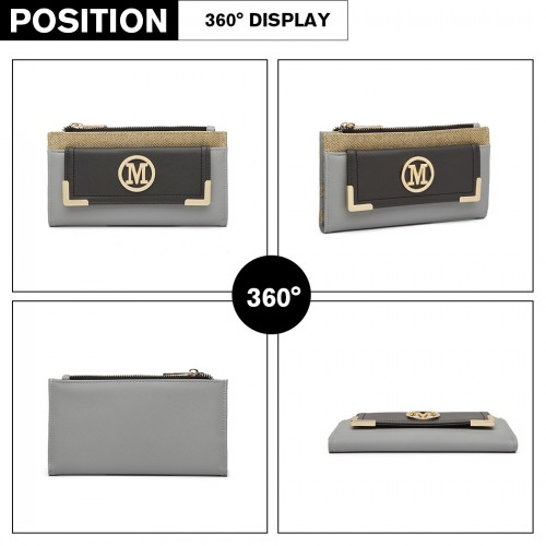 LP6882-MISS LULU PEBBLED LEATHER LOOK M METAL LOGO LONG PURSE GREY