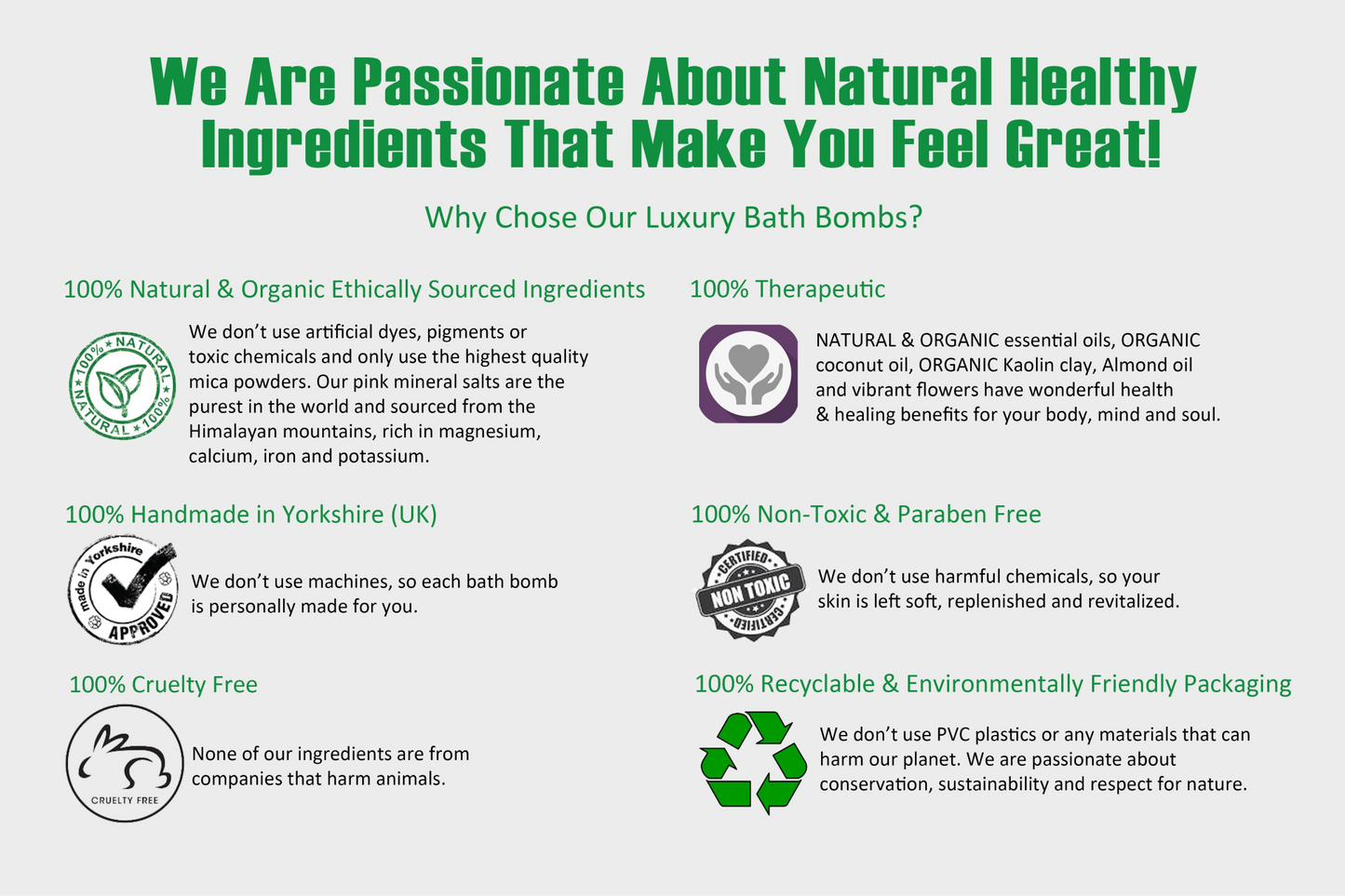 Our bath bombs are full of natural, organic goodness and have been assessed by Cosmetic Safety Consultants and have passed with Cosmetic Safety Product Report (CSPR).