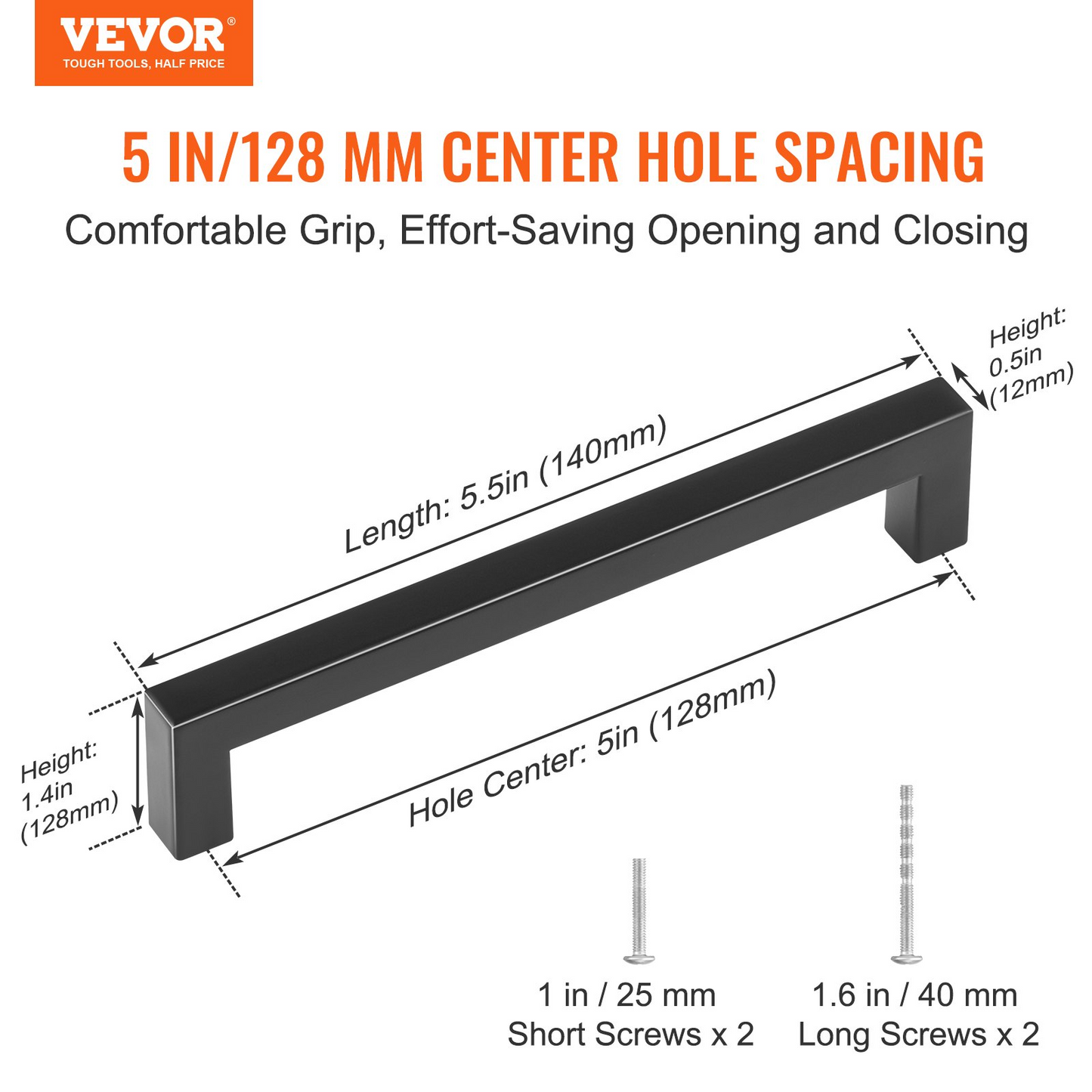 Primary Material: Stainless Steel,Item Dimensions (L x W x H): 5.51 x 0.47 x 1.38 inches / 140 x 12 x 35 mm,Net Weight (including all accessories): 1.37 lbs / 0.62 kg,Center Hole Spacing: 5.03 inches / 128 mm,Gross Weight (including accessories and packaging): 1.54 lbs / 0.7 kg,Item Model Number: 6003-128mm-black,Quantity: 10 pieces
