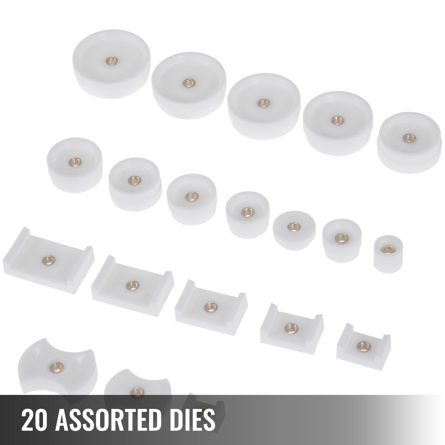 Size(LxWxH): 11.4 x 10.2 x 20.3 cm / 4.5 x 4 x 8",Round size: 18/20, 21/23, 24/26, 28/30, 31/32, 33/34, 36/38, 40/42, 43/45, 48/50 mm,Square size: 20, 25, 30, 35, 40, 45 mm,Color: Red,Two Round of dies: 16/16 20/25 mm,Material: Aluminum alloy,Shield size: 37,45 mm