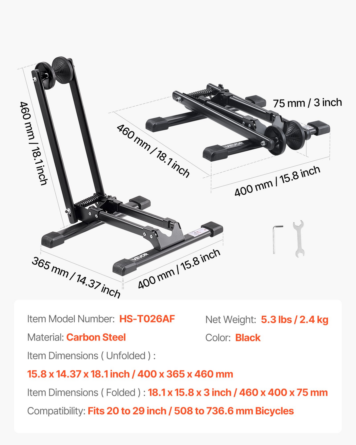 Color: Black,Item Model Number: HS-T026AF,Quantity: 1,Material: Carbon Steel,Item Dimensions (Folded): 18.1 x 15.8 x 3 inch / 460 x 400 x 75 mm,Item Dimensions (Unfolded): 15.8 x 14.37 x 17.5 inch / 400 x 365 x 445 mm,Compatibility: Fits 20 to 29 inch / 508 to 736.6 mm Bicycles,Net Weight: 5.3 lbs / 2.4 kg