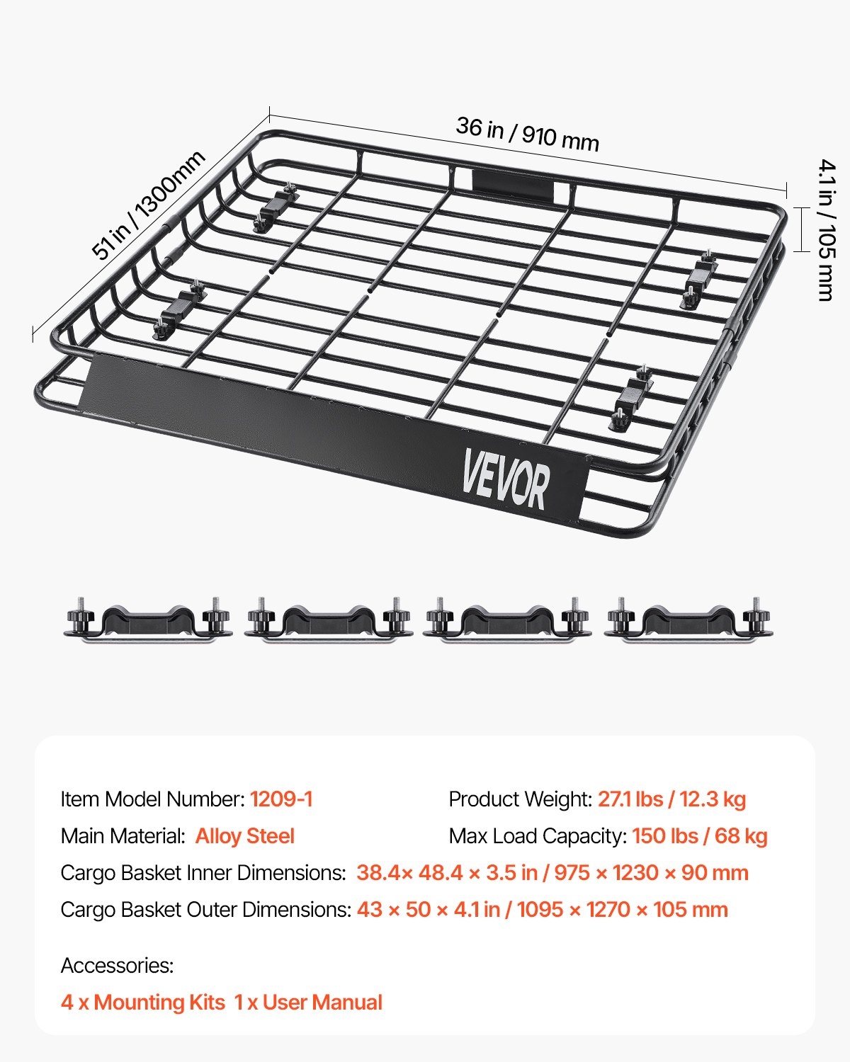Cargo Basket Outer Dimensions: 43 x 50 x 4.1 in / 1095 x 1270 x 105 mm,Item Model Number: 1209-1,Product Weight: 27.1 lbs / 12.3 kg,Max Load Capacity: 150 lbs / 68 kg,Main Material: Alloy Steel