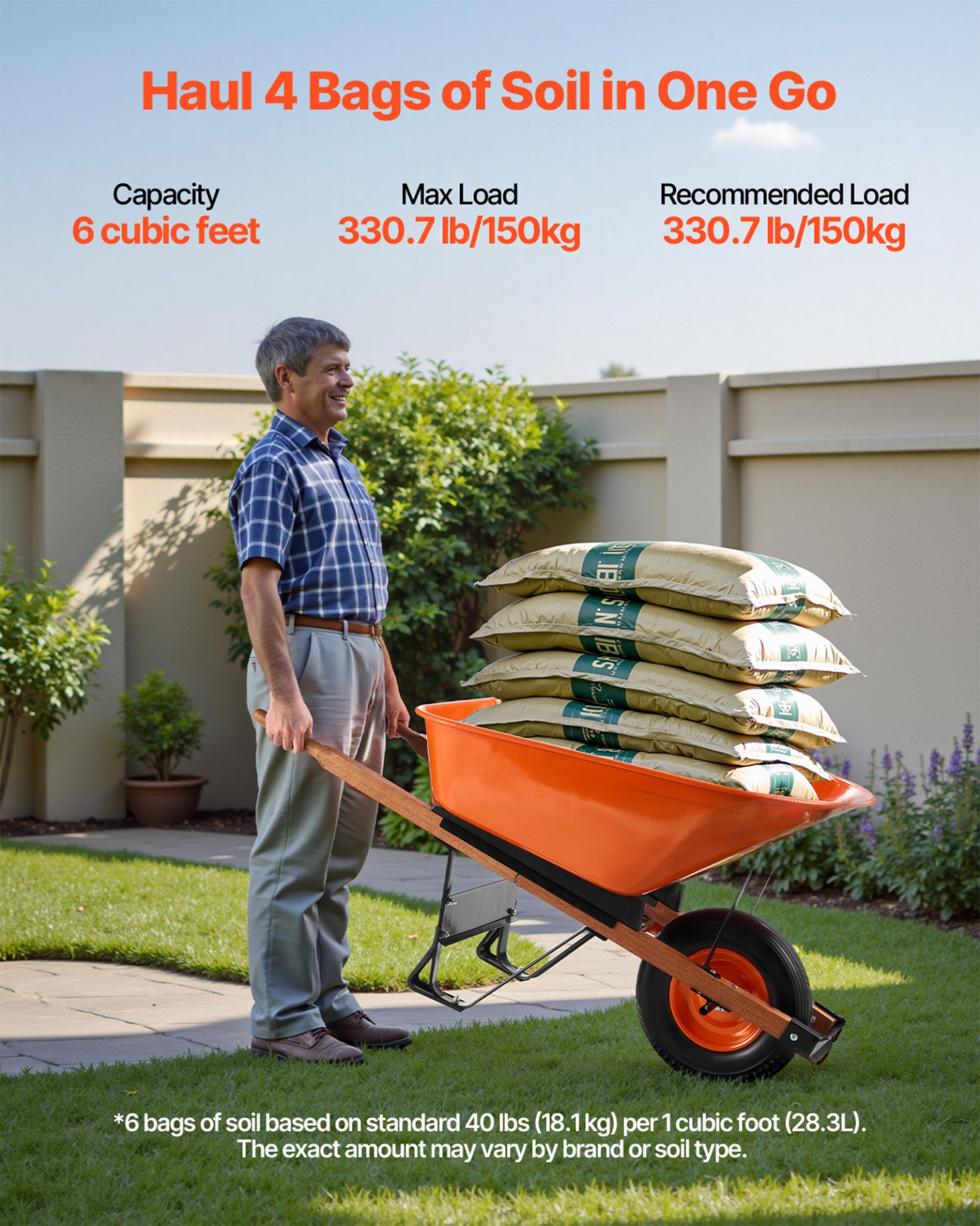 VEVOR Wheelbarrow Cart One Wheel 6 Cu Ft Garden Dump Cart 330 lbs Utility Cart