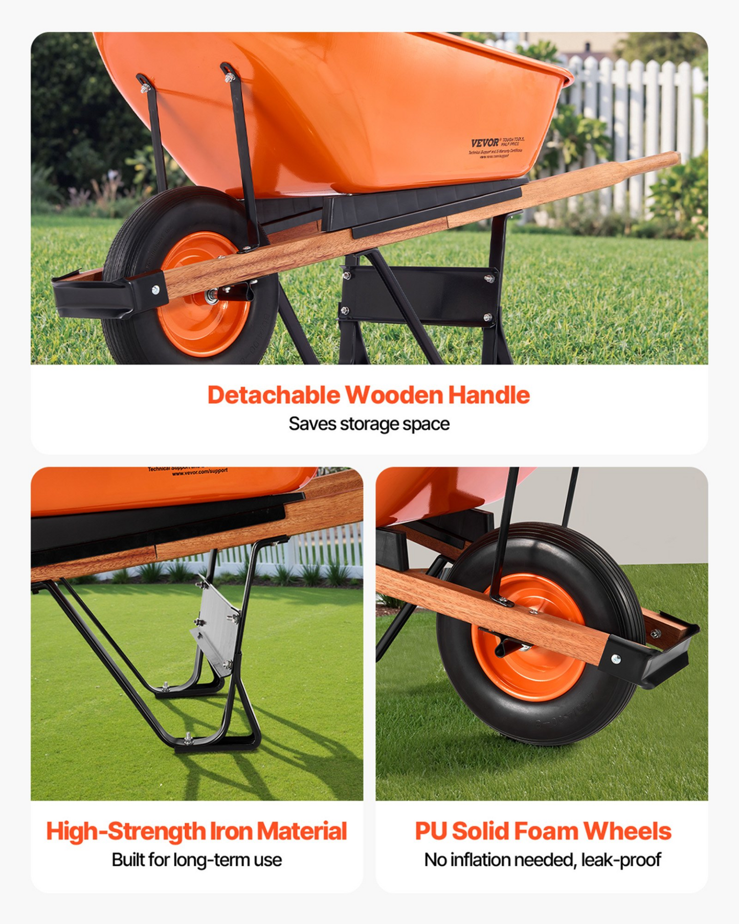 Tire Size: φ16x4'',Color: Orange + Black,Maximum Load Capacity: 330 lbs/150 kg,Product Model: WB-007A,Cart Bed Dimensions: 38.39 x 25.59 x 11.81 in / 97.5 x 65 x 30 cm,Product Dimensions: 54.72 x 25.59 x 27.56 in / 139 x 65 x 70 cm,Net Weight: 36.6 lbs/16.6 kg,Main Material: Iron + PU (Solid Foam Wheel)