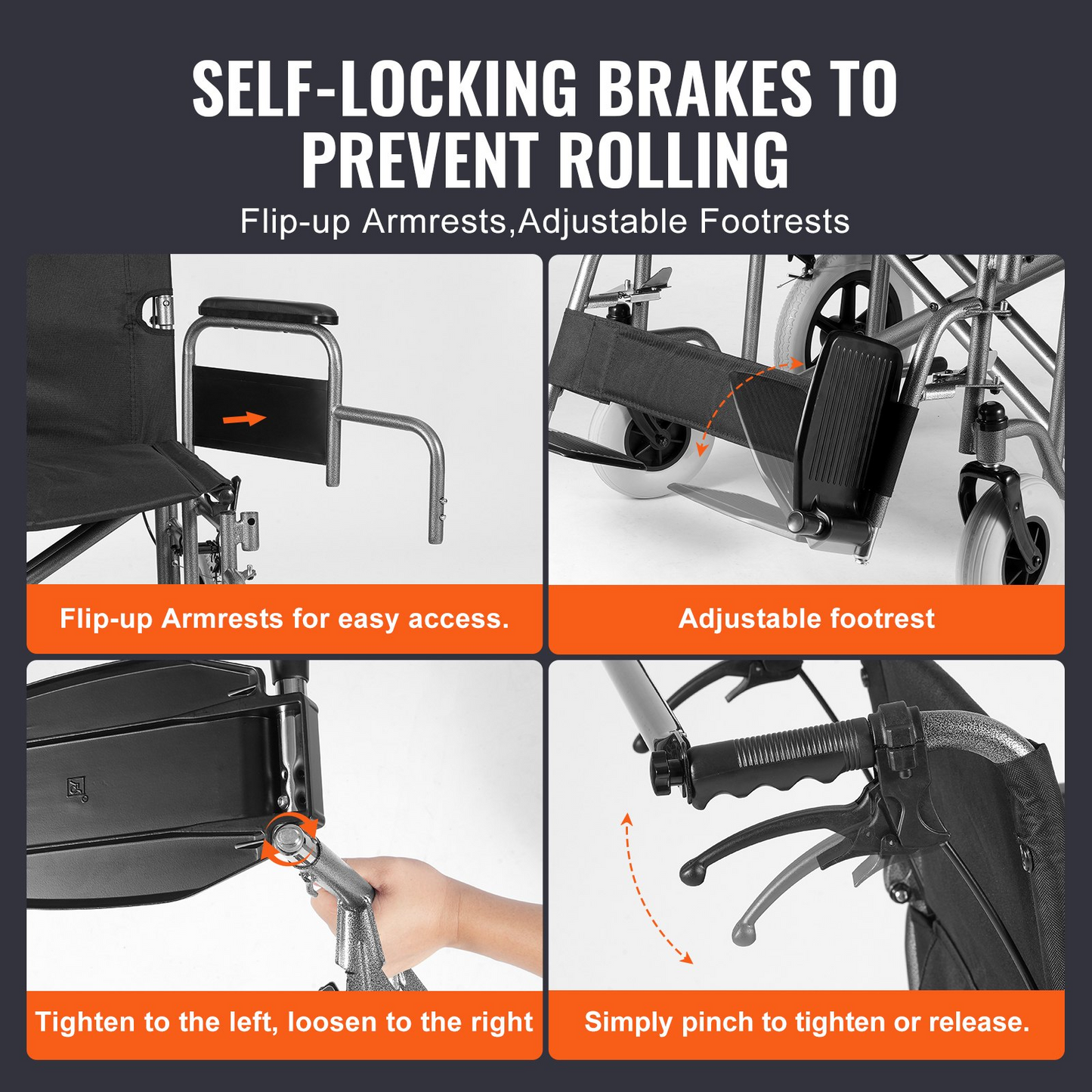 VEVOR Wheelchair Steel Transport Chair Foldable Wheelchair 24-In W Seat 300lbs