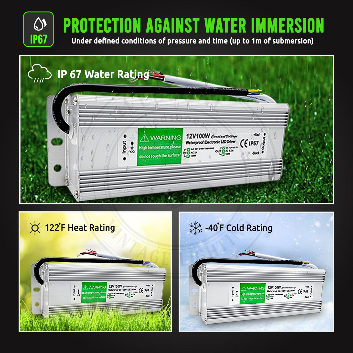 - LED driver is designed to be enclosed in an aluminum alloy casing with rubber-sealed cables, achieving an IP67 waterproof protection rating.